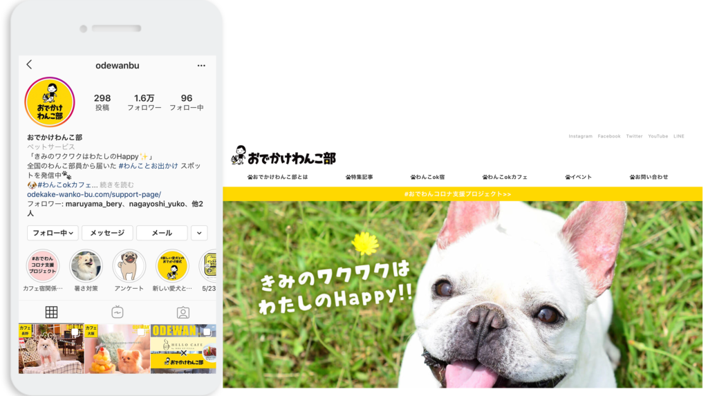 | 事業内容 | 【メディア運営業】おでかけわんこ部 【企画プロデュース・コンサルティング事業】 【アフィリエイト事業】 【Instagramコンサルティング業】 【イベント及び交流会、セミナー等の企画、開催及び運営業】 【オリジナル商品の企画、製造及び卸売、小売業】 |
